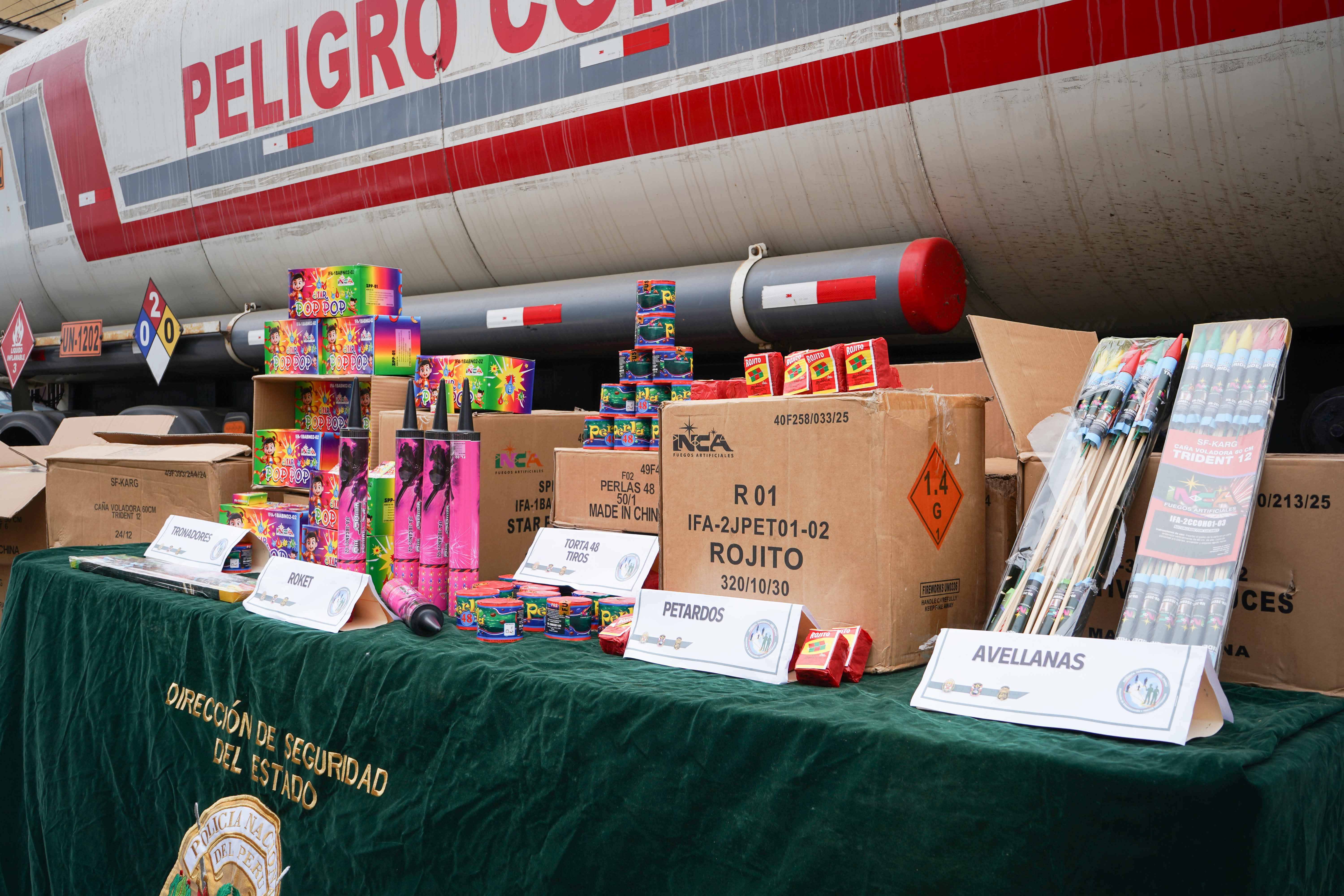 Un total de 400 cajas de productos pirotécnicos incautados por agentes de la División de Investigación de Delitos contra el Estado, de la Policía Nacional, fueron entregados en custodia a la Superintendencia Nacional de Control de Servicios de Seguridad, Armas, Municiones y Explosivos de Uso Civil (Sucamec) para evitar su comercialización ilegal y salvaguardar la seguridad de las personas, tras ser descubiertos dentro de una cisterna para combustible, en el distrito limeño de El Agustino.