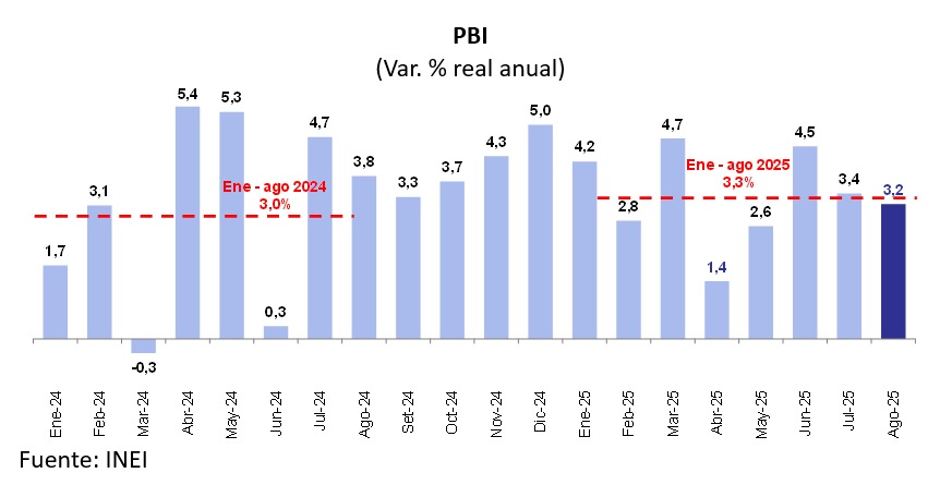 El Ministerio de Economía y Finanzas (MEF) destacó que la actividad económica del país continúa en expansión por 17 meses consecutivos, consolidando una trayectoria sostenida de crecimiento. De acuerdo con el Instituto Nacional de Estadística e Informática (INEI), en agosto de 2025 la economía peruana creció 3,2 %, con lo cual el Producto Bruto Interno (PBI) acumuló un avance de 3,3 % entre enero y agosto de este año. Este resultado refleja el sólido desempeño de los sectores productivos, y reafirma la confianza empresarial en la consolidación de la economía.