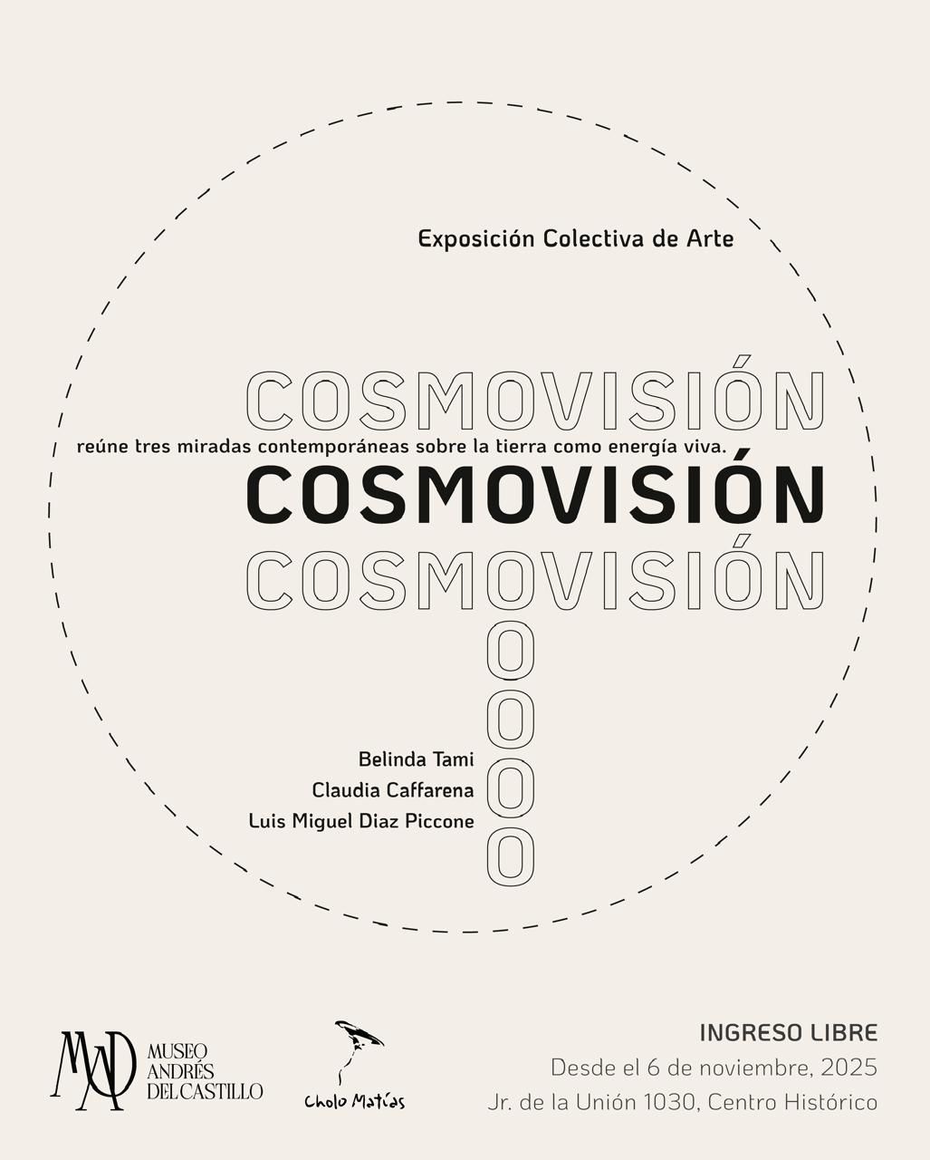 El Museo de Minerales Andrés del Castillo presenta Cosmovisión, una exposición que reúne las obras de Belinda Tami, Luis Miguel Díaz Piccone y Claudia Caffarena, tres artistas que exploran la profunda conexión entre el ser humano, la naturaleza y la energía que los une. La muestra estará abierta al público del 6 de noviembre al 16 de enero de 2026 en la Sala de Exposiciones del museo, ubicado en Jr. de la Unión 1030, Cercado de Lima, con ingreso libre todos los días de 10:00 a.m. a 7:00 p.m.