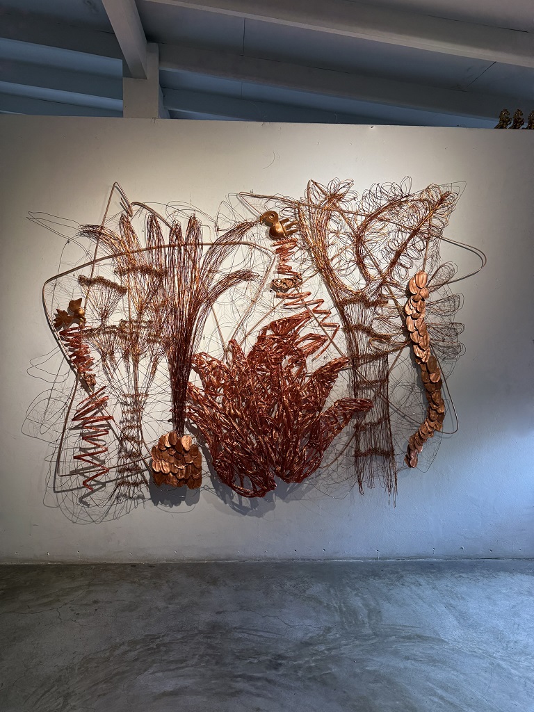 Cosmovisión propone una reflexión sobre la materia como memoria y energía viva. A través del barro, el cobre, el pigmento y la textura, las obras revelan que en lo aparentemente inerte habita un lenguaje simbólico que trasciende lo visible. La muestra cuestiona la mirada occidental que históricamente ha separado al ser humano de la naturaleza, transformando lo sagrado en mercancía y lo ritual en ornamento.