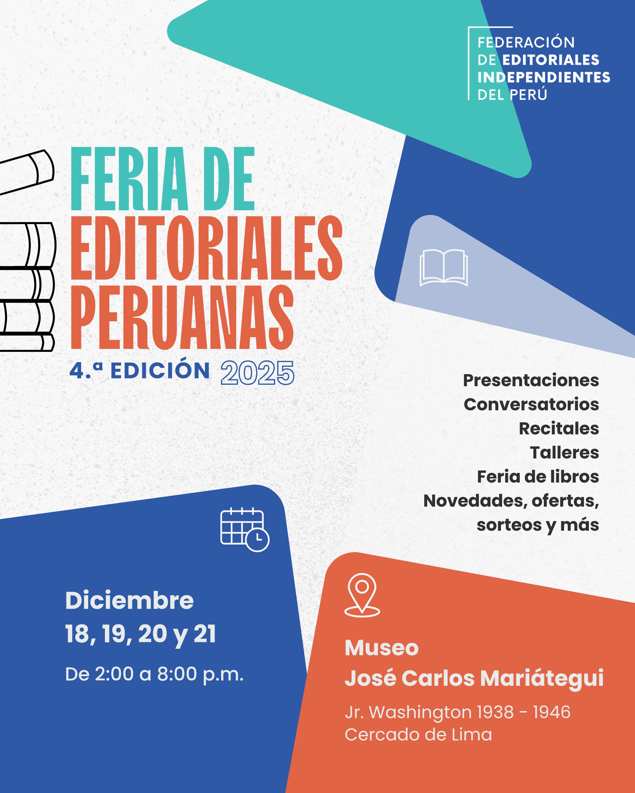 La Federación de Editoriales Independientes del Perú (FEIP), en colaboración con el Museo José Carlos Mariátegui, anuncia la Feria de Editoriales Peruanas – Cuarta edición 2025, que se realizará del 18 al 21 de diciembre, de 2:00 p. m. a 8:00 p. m., en la histórica Casa Museo Mariátegui (Jr. Washington 1946, Cercado de Lima). Este evento representa el encuentro editorial independiente más importante del cierre del año, consolidándose como una plataforma de difusión, diálogo y acceso al libro para todo tipo de públicos.