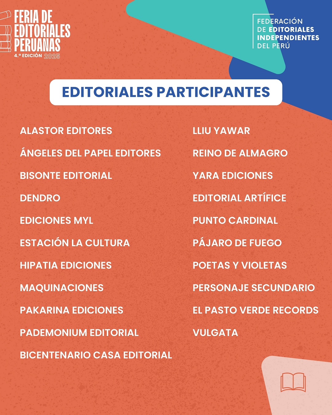 La feria reunirá a 21 editoriales independientes de distintas regiones del país, incluyendo sellos de Arequipa, Huancayo, Trujillo y Loreto, que ofrecerán al público una vitrina actualizada de su catálogo, así como novedades publicadas durante el 2025. La diversidad de propuestas —que abarca narrativa, poesía, ciencias sociales, literatura infantil, ensayo, gráfica independiente y proyectos experimentales— reafirma el compromiso de la FEIP con la bibliodiversidad y la circulación del libro peruano.