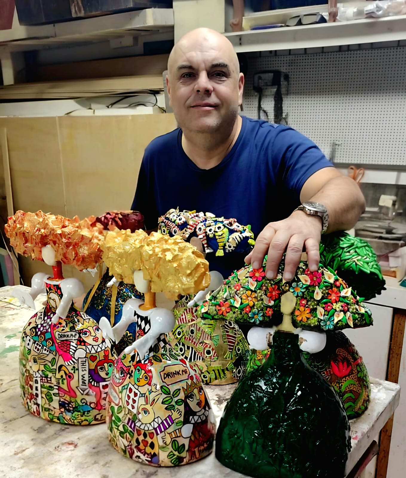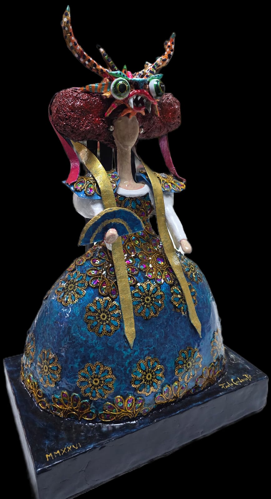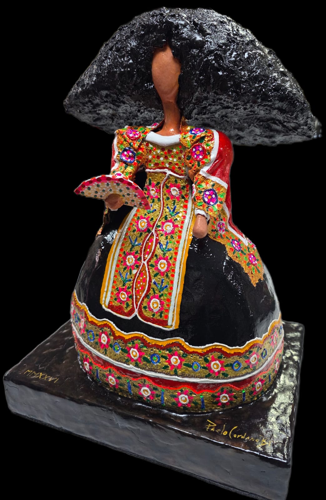 Cordano concibe el vestido de la menina como una metáfora del territorio. Sobre su amplia silueta aparecen montañas, ríos, flores, animales y escenas de la vida cotidiana que evocan oficios, tradiciones y memorias colectivas. De esta manera, cada escultura se convierte en una pequeña geografía simbólica donde conviven diferentes raíces culturales.
