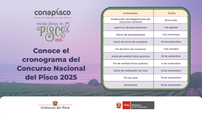 Sigue las actividades de este importante evento en la página oficial del Concurso Nacional del Pisco: https://www.gob.pe/institucion/produce/campa%C3%B1as/114781-concurso-nacional-del-pisco-2025