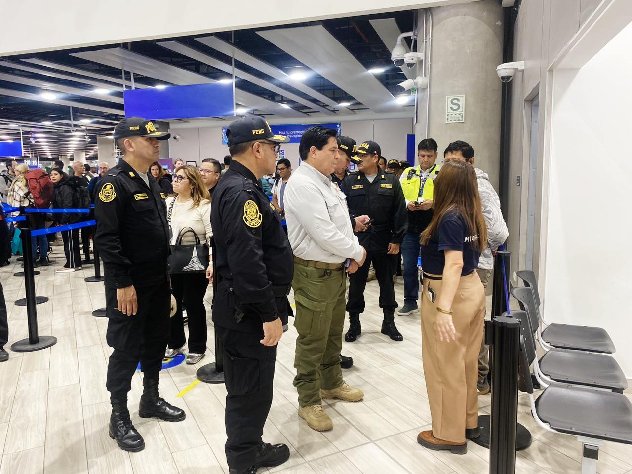 El titular del Interior fue recibido por los generales PNP Carlo Mori Rimachi, director de Fronteras, y Michael Flores Álamo, director de Turismo. Además, lo acompañó el coronel PNP Óscar Gonzales Troncos, jefe de la División de Seguridad Aeroportuaria, con quienes recorrió los diversos puestos a cargo de la Policía Nacional.