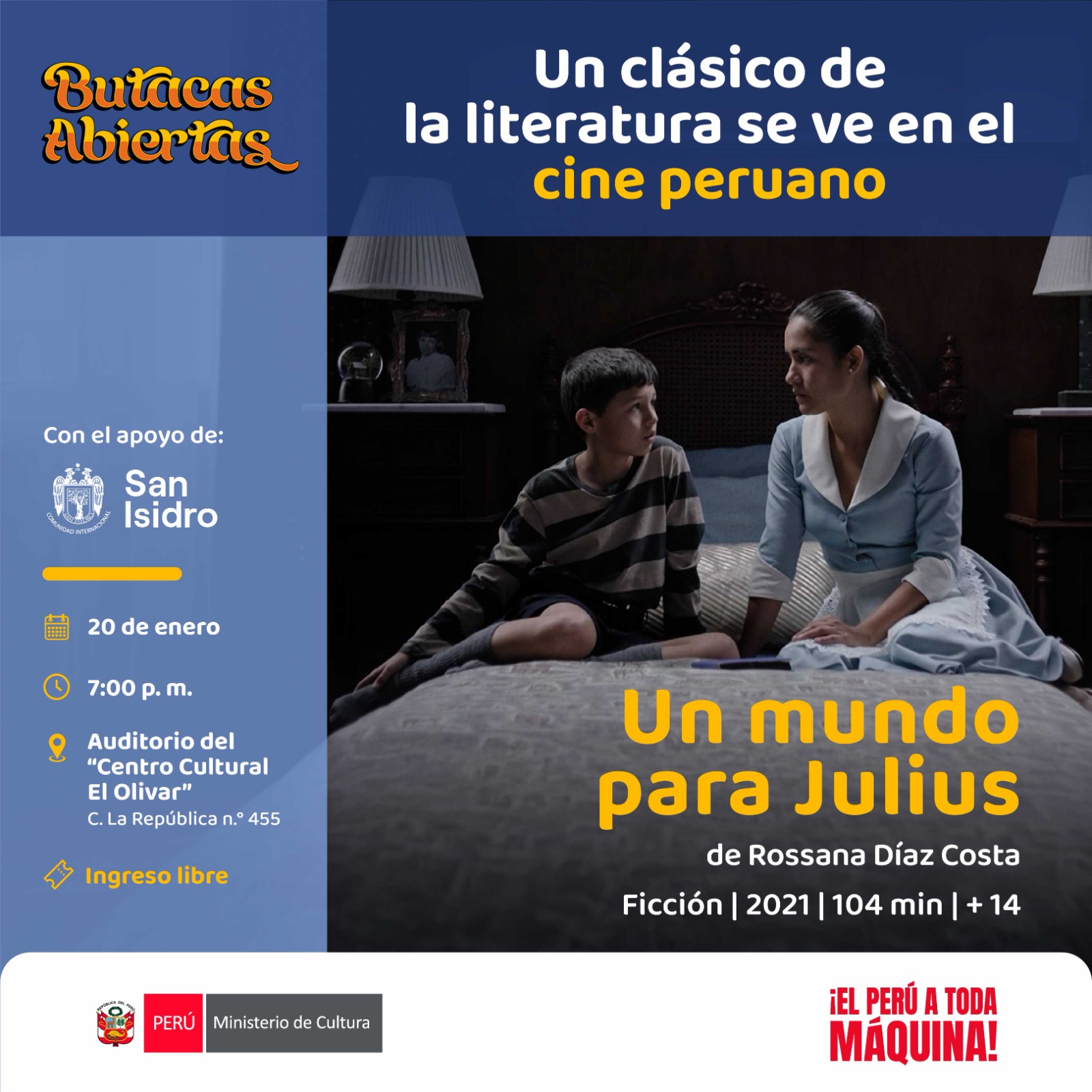 Con “Butacas Abiertas”, la Municipalidad de San Isidro y el Ministerio de Cultura apuestan por democratizar el acceso al cine peruano, fomentar el encuentro ciudadano y poner en valor la riqueza y diversidad de las producciones audiovisuales nacionales.